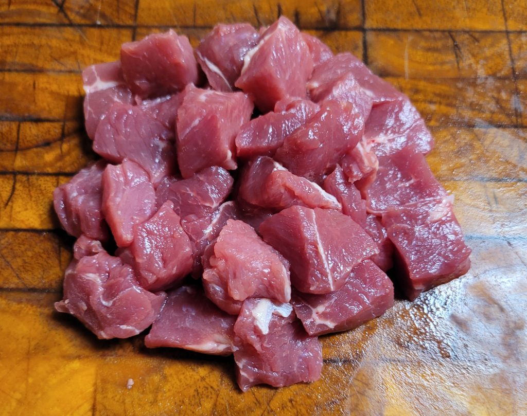 Cut the Strip Steak into 1/2″-3/4″ cubes and mix the marinade ingredients. Marinade the meat for 1-4 hours.