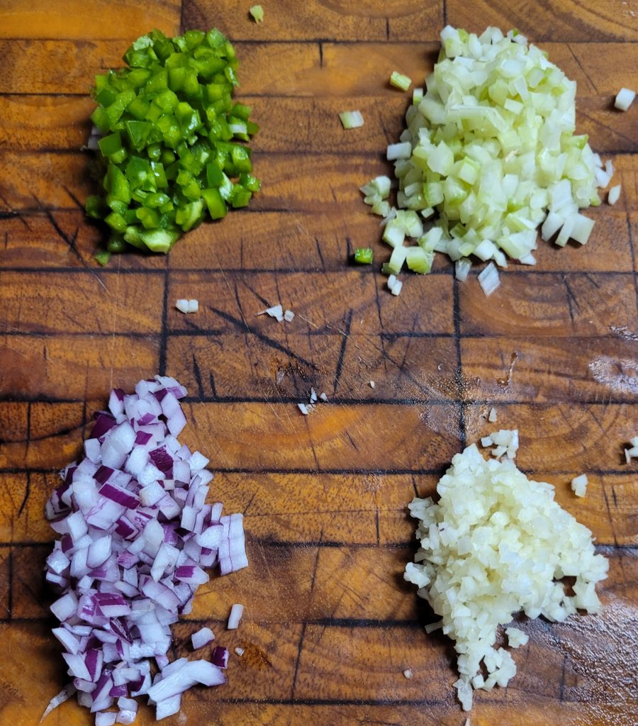 Chop the onion, bell pepper, and celery, and mince the garlic finely.