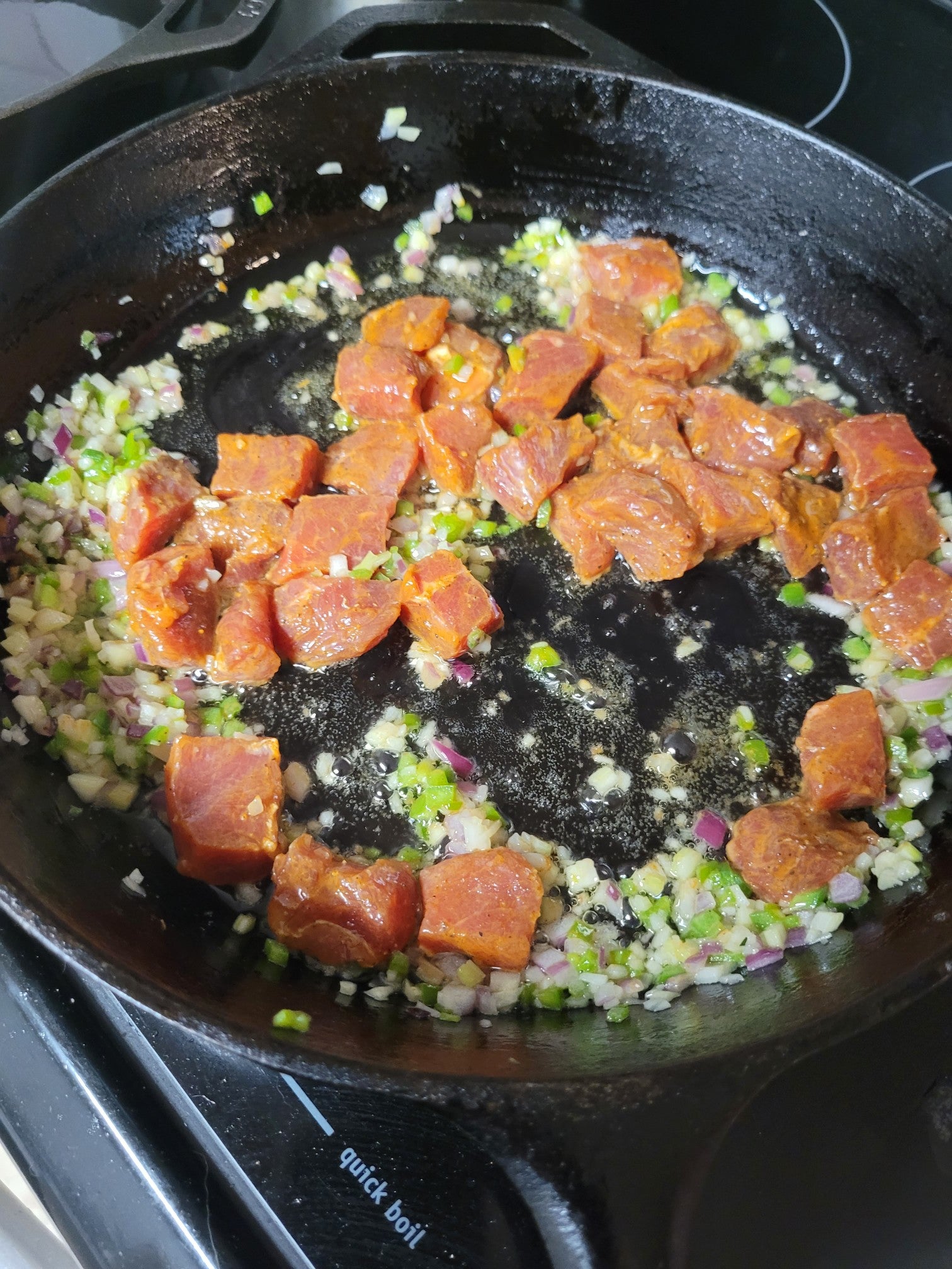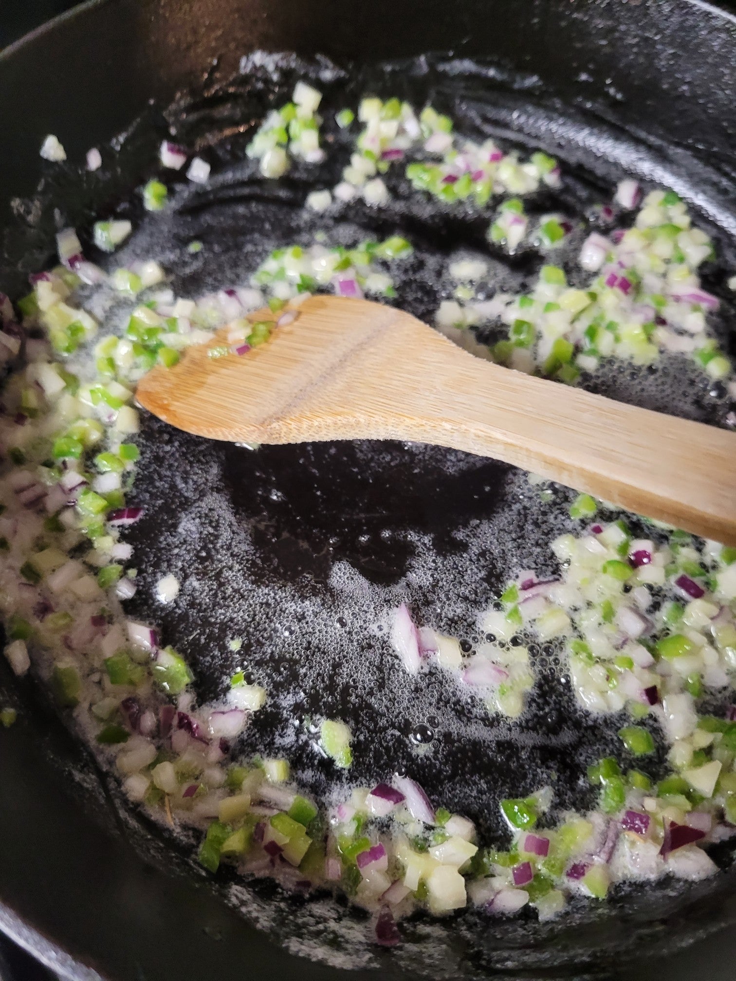 Add the Trinity (not the garlic yet) and saute for 3-4 minutes, until starting to soften. Add the garlic and saute another minute, then add the meat and turn the heat up to medium-high. Cook the meat, stirring regularly, until browned and fully cooked. Add salt to taste
