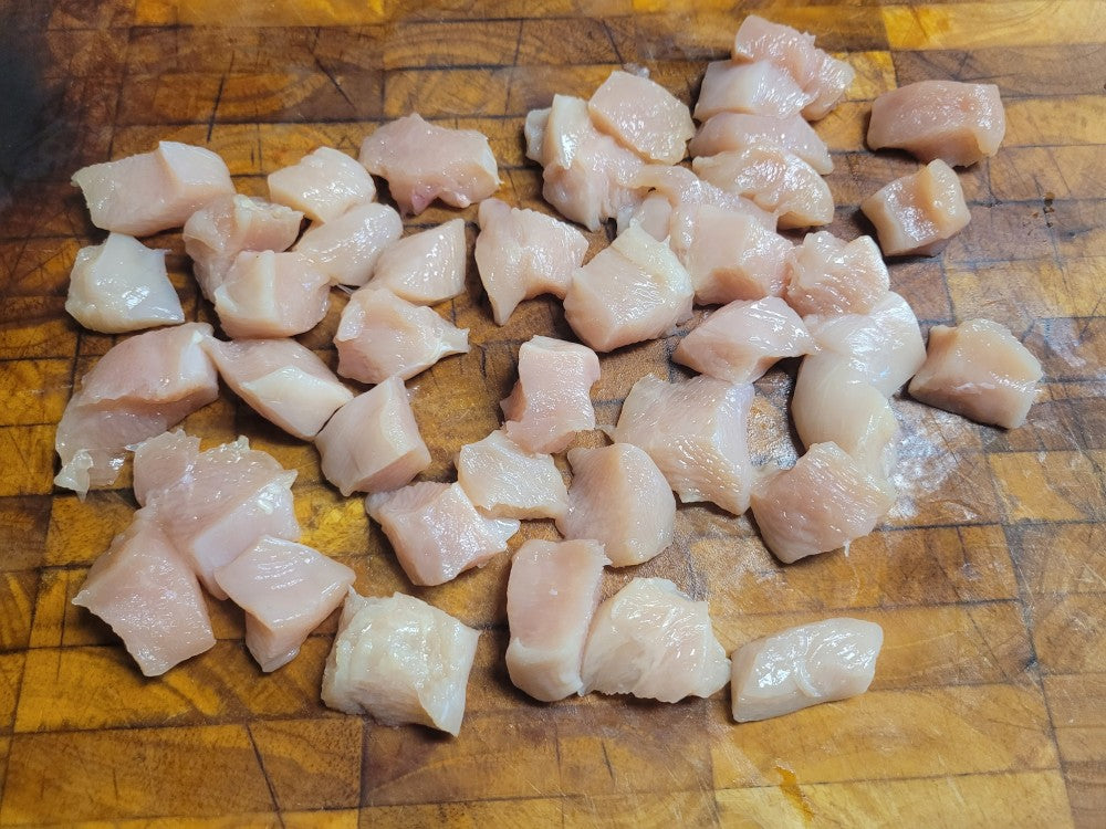 Mix the marinade ingredients together. Cut the chicken into 3/4″-1″ cubes, then add to marinade, mixing until the chicken is thoroughly covered. Marinade for 2-4 hours.