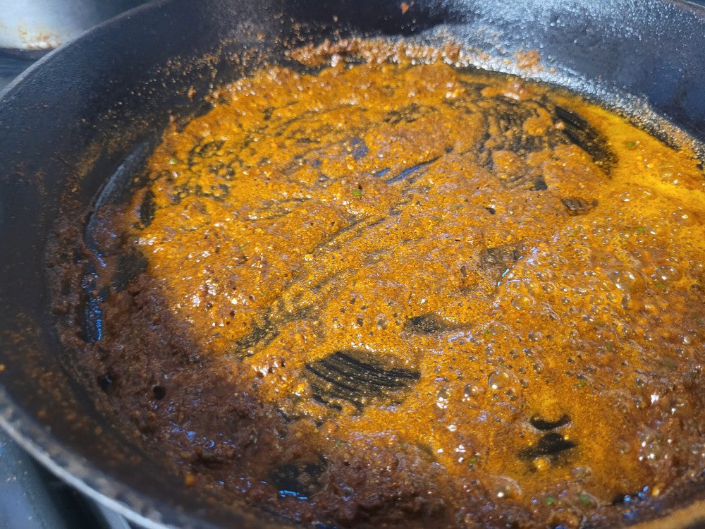 While the chicken is cooking you can start the sauce. Melt the ghee, then add the garlic and hot pepper. Saute for 1-2 minutes, then add all the powdered spices. Stir to coat them in the ghee and cook for another 1-2 minutes to bloom the spices.