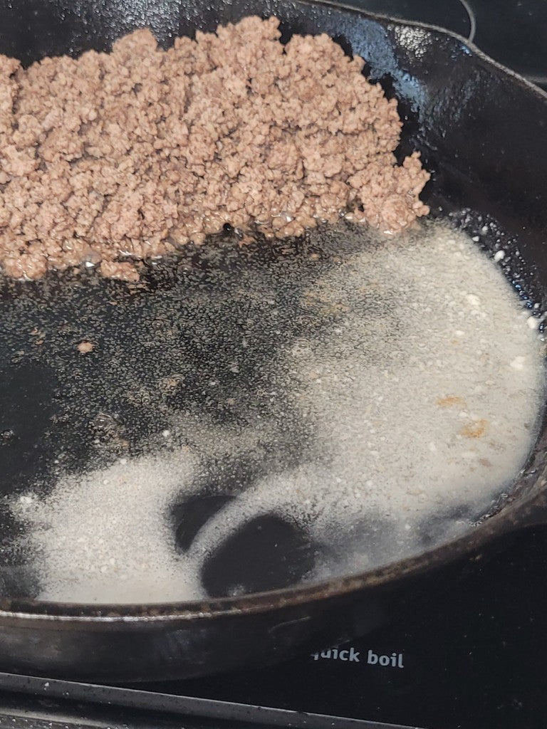 Crumble the ground beef into the pan and cook until browned, breaking up the chunks. When it is fully cooked, move the beef to one side of the pan and tilt to flow the fat on the other side. Add the corn starch and mix into the oil evenly. Once the corn starch is fully mixed, stir it back into the beef.
