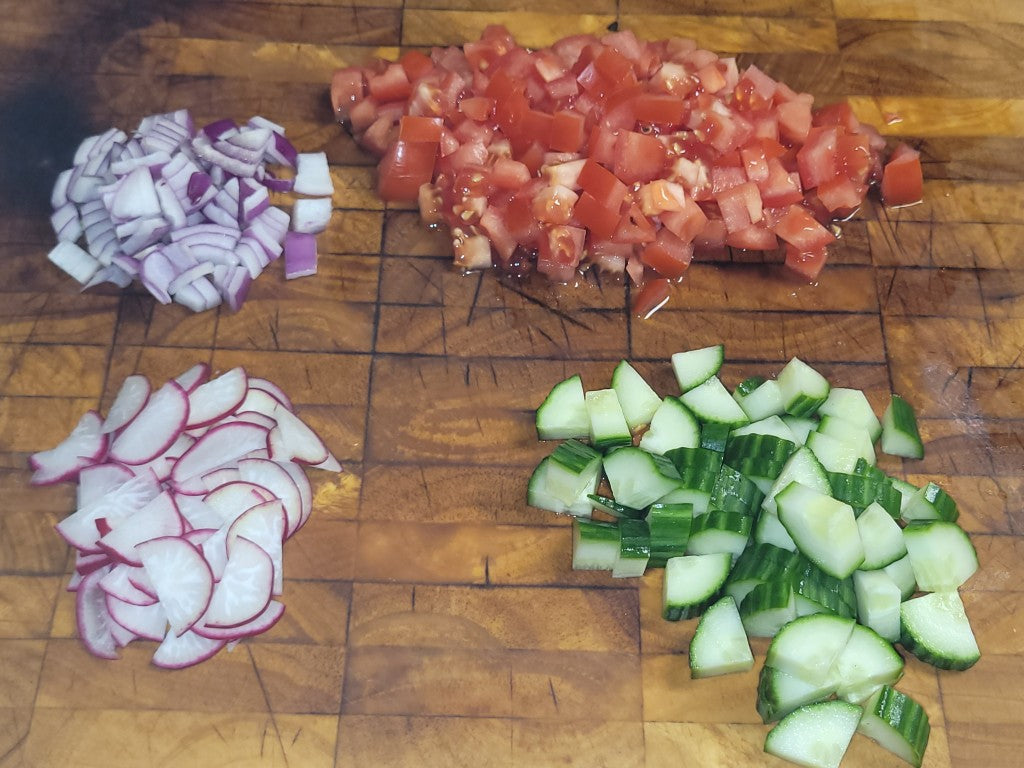 Coarsely chop the tomatoes, onions, and cucumber, and slice the radishes. Set aside.